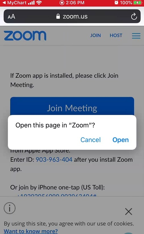 4. Select “Open” when the Zoom pop-up asks “Open this page in Zoom?”