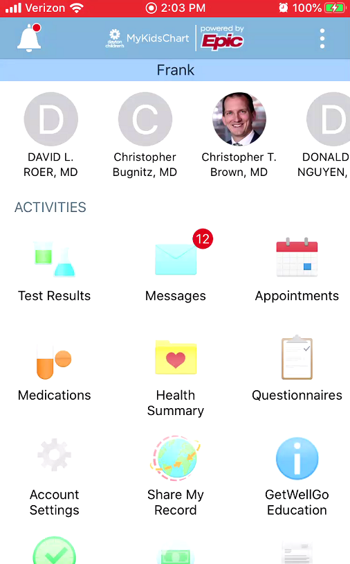 Download the MyChart mobile app (Apple, Google Play) and log into your Dayton Children’s account. If you forgot your password or need help setting up an account, call our help desk at 877-355-3155.