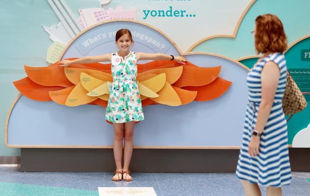 The design theme of the tower is “things that fly” to honor Dayton’s rich aviation heritage and innovation in flight. Visitors will notice themed elements the moment they cross the family-friendly lobby into the three-story atrium called the Take Flight Gallery. Filled with light, color and whimsy, this space houses the Culinairy Kitchen full service cafeteria, the Up Cafe for grab-and-go food items and the Altitude gift shop. Visitors will also notice the main design feature in the Take Flight Gallery is the Dragonflyer.