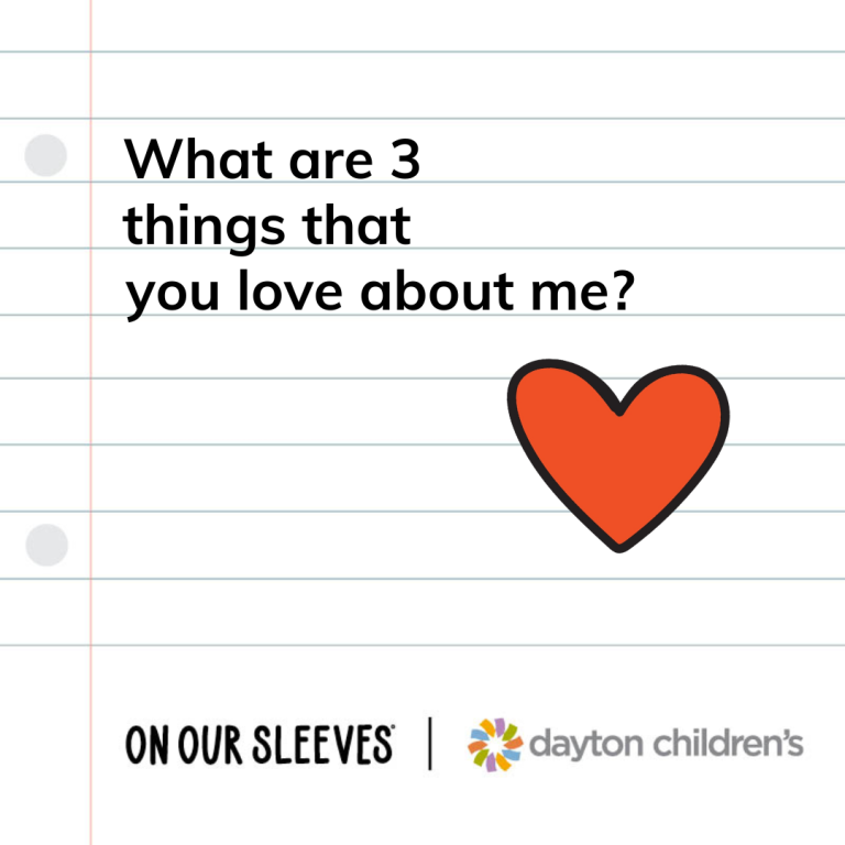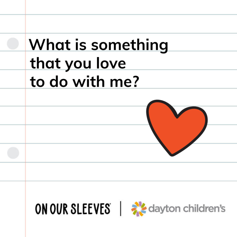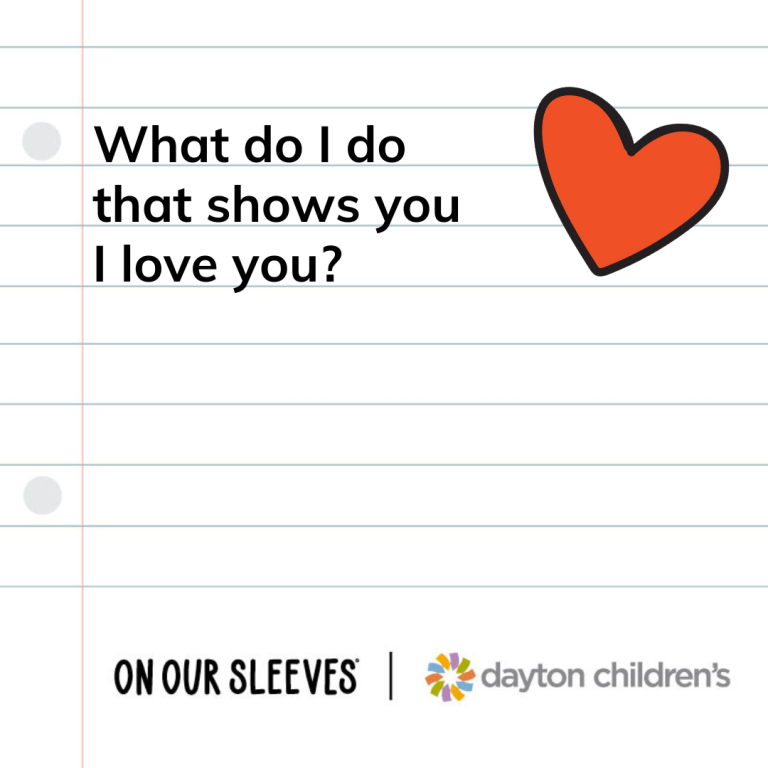 On Our Sleeves encourages parents and caregivers to have conversations with the children in their life about every topic imaginable, and talking about how much you love them is no different. By starting the conversation you can learn more about how your child experiences love, what they’ve learned from you about how to show love, and their perspective on what healthy love looks like.