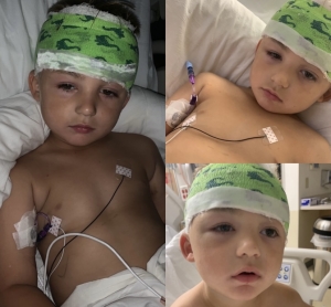 When Brayson and his family arrived at Dayton Children’s, a team was already in place and waiting for them. They were quickly taken to a trauma room in the emergency department where they met Robert Lober, MD, pediatric neurosurgeon. Dr. Lober explained to the Cosby family that he was going to remove the nail from Brayson’s head by performing a bifrontal craniotomy with a hairline incision.