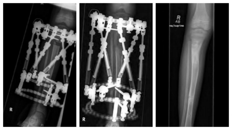 During her lengthening of the tibia, she developed an equinus contracture on the lengthened leg requir­ing a percutaneous heel cord lengthening upon removal of the frame.