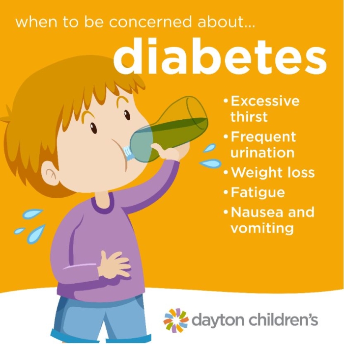 If your child has experienced the first three symptoms and is nauseous or throwing up, it is time for a visit to an emergency department. Once a child with symptoms of diabetes starts throwing up, it’s a sign they have acid in their blood, which is very dangerous. They could be in diabetic ketoacidosis (DKA) and would require immediate attention.