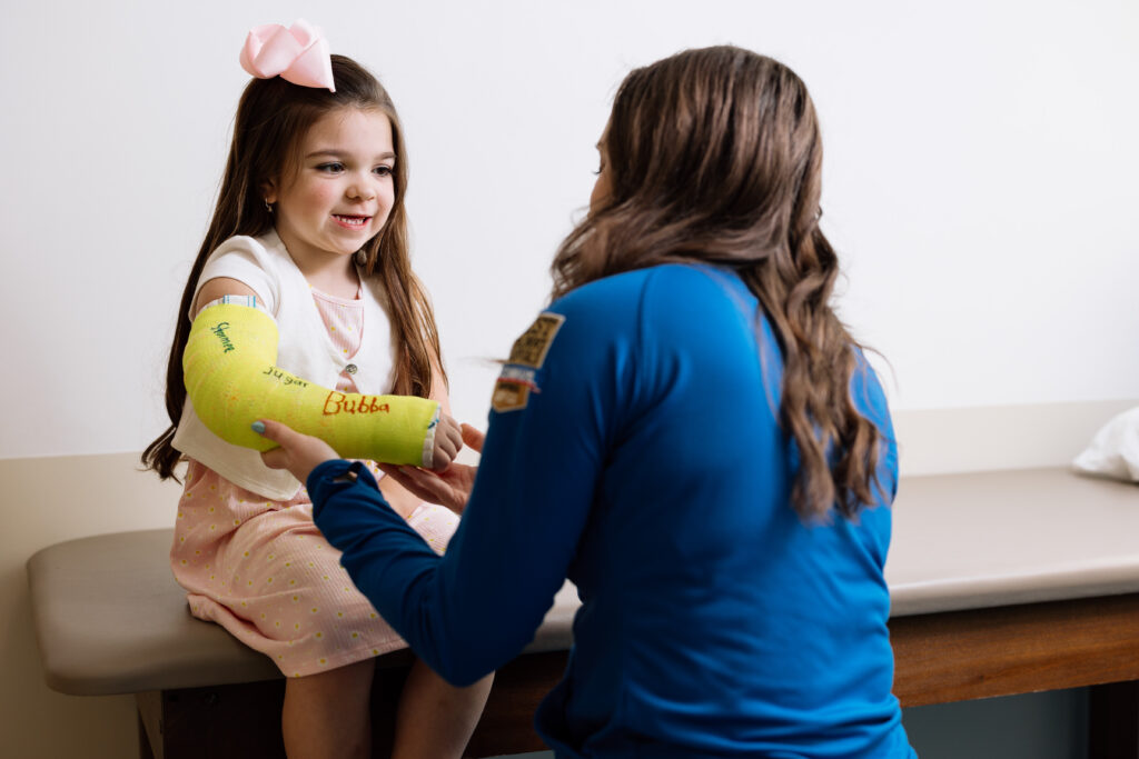 female orthopedic surgeon holding the arm of a young girl during a pediatric appointment