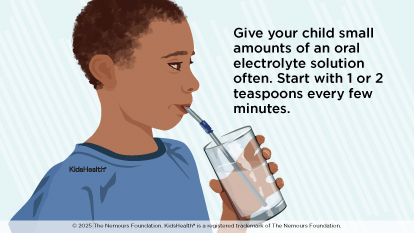 • Give your child small amounts of an oral electrolyte solution often. If your child throws up, start with small sips, about 1 or 2 teaspoons every few minutes.